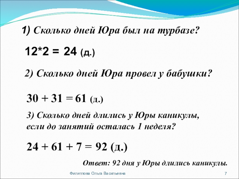 3) Сколько дней длились у Юры каникулы, если до занятий осталась 1 неделя?