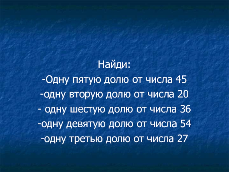 Найди:-Одну пятую долю от числа 45-одну вторую долю от числа 20- одну шестую долю от числа 36-одну девятую долю от числа 54-одну третью долю от числа 27