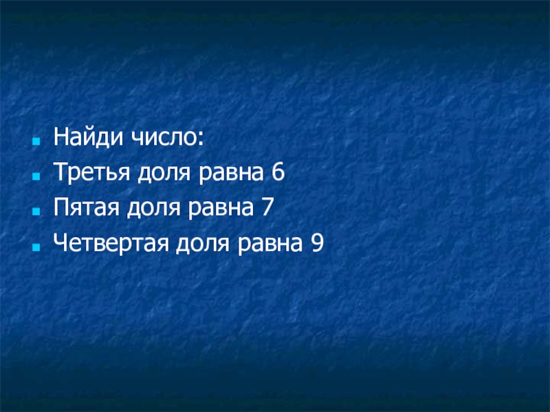 Найди число:Третья доля равна 6Пятая доля равна 7Четвертая доля равна 9