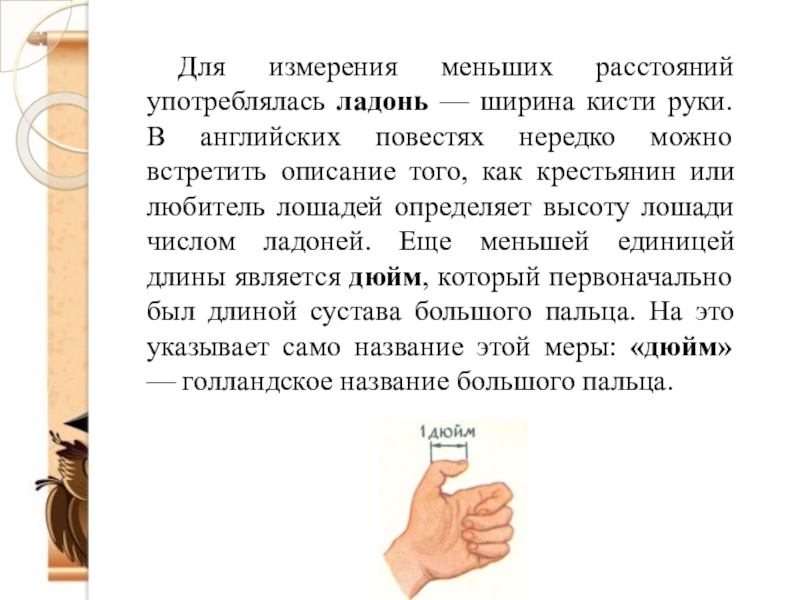 Слайд 7Для измерения меньших расстояний употреблялась ладонь — ширина кисти руки. В