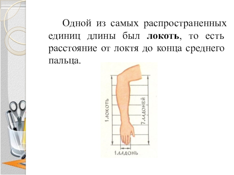 Слайд 6 Одной из самых распространенных единиц длины был локоть, то есть расстояние