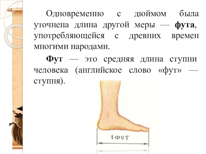 Слайд 8 Одновременно с дюймом была уточнена длина другой меры — фута, употребляющейся