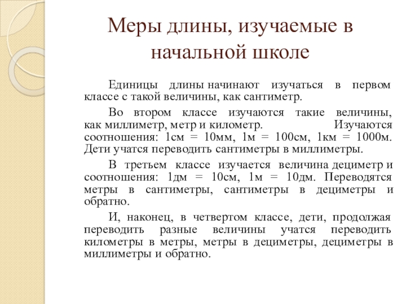 Меры длины, изучаемые в начальной школе				Единицы длины начинают изучаться в первом классе с такой величины, как сантиметр. 		Во втором