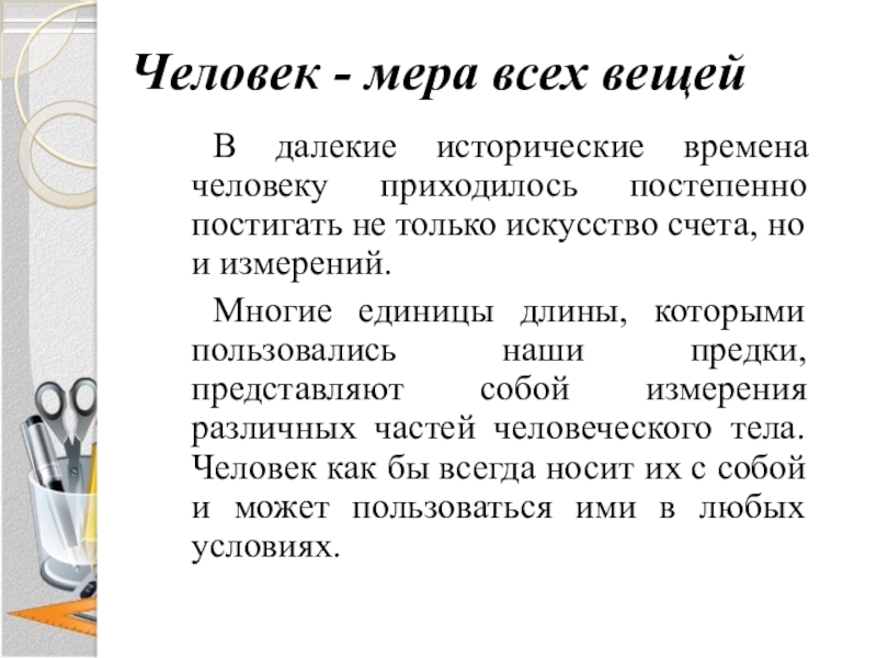 Человек - мера всех вещейВ далекие исторические времена человеку приходилось постепенно постигать не только искусство счета, но и измерений.Многие единицы длины, которыми пользовались наши предки, представляют собой измерения различных частей человеческого тела. Человек как бы всегда