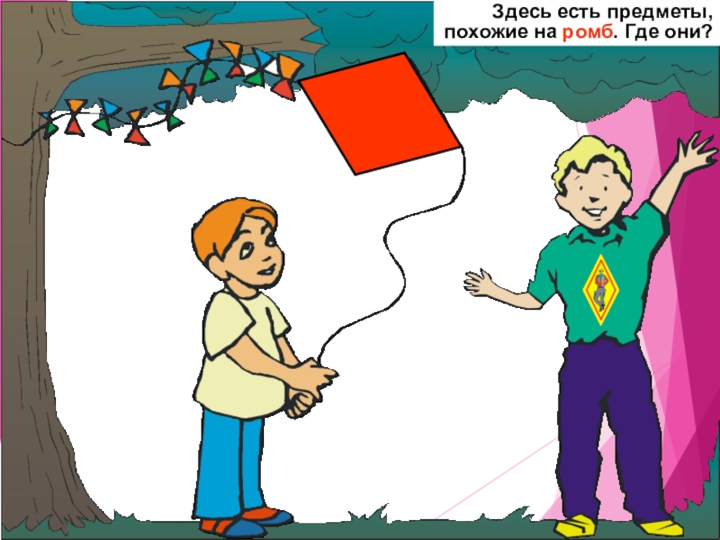 Слайд 13Здесь есть предметы, похожие на ромб. Где они?