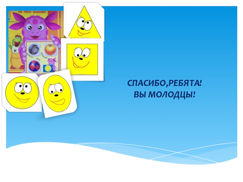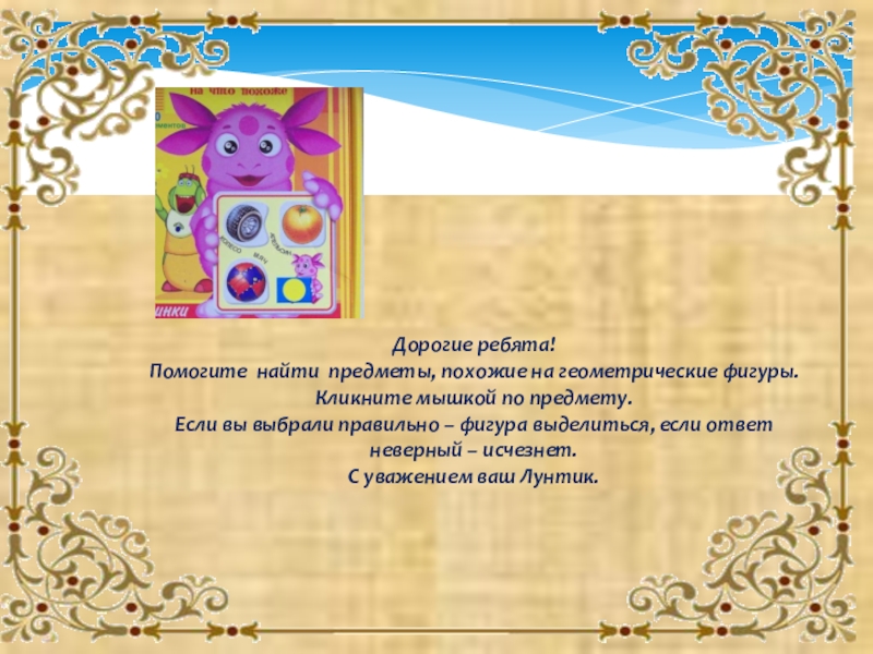 Дорогие ребята!Помогите найти предметы, похожие на геометрические фигуры.Кликните мышкой по предмету. Если вы выбрали правильно – фигура выделиться, если ответ неверный – исчезнет.С уважением ваш Лунтик.