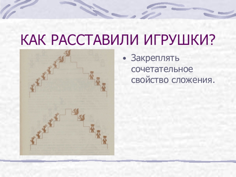 КАК РАССТАВИЛИ ИГРУШКИ?Закреплять сочетательное свойство сложения.