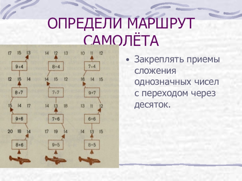 ОПРЕДЕЛИ МАРШРУТ САМОЛЁТАЗакреплять приемы сложения однозначных чисел с переходом через десяток.