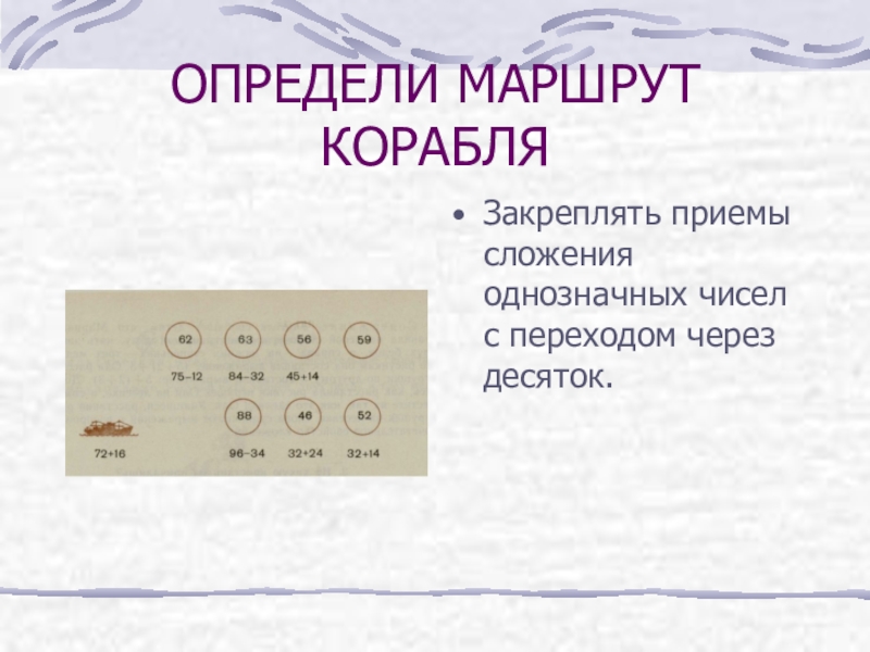 ОПРЕДЕЛИ МАРШРУТ КОРАБЛЯЗакреплять приемы сложения однозначных чисел с переходом через десяток.