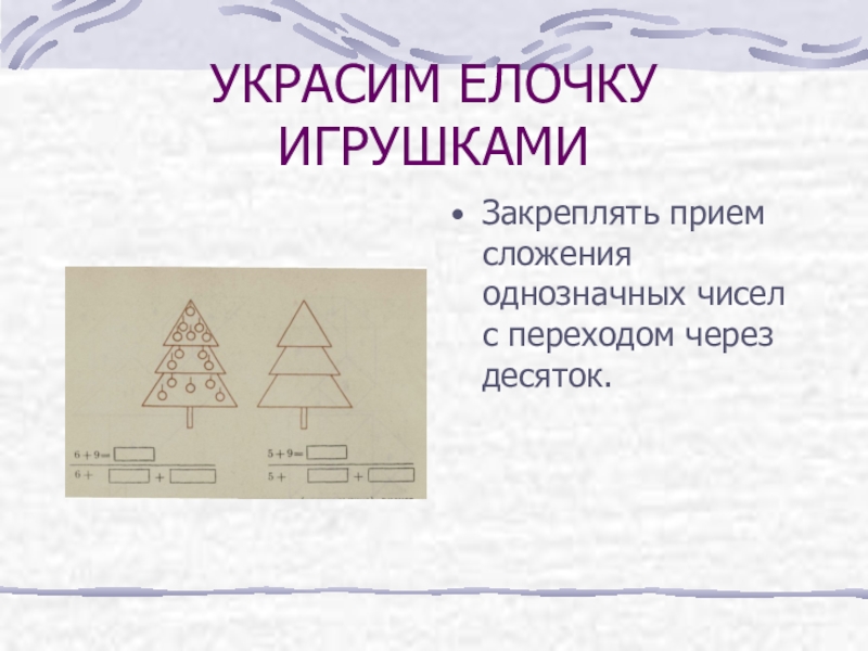 УКРАСИМ ЕЛОЧКУ ИГРУШКАМИЗакреплять прием сложения однозначных чисел с переходом через десяток.
