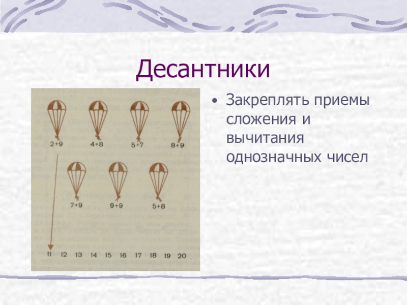 Десантники Закреплять приемы сложения и вычитания однозначных чисел