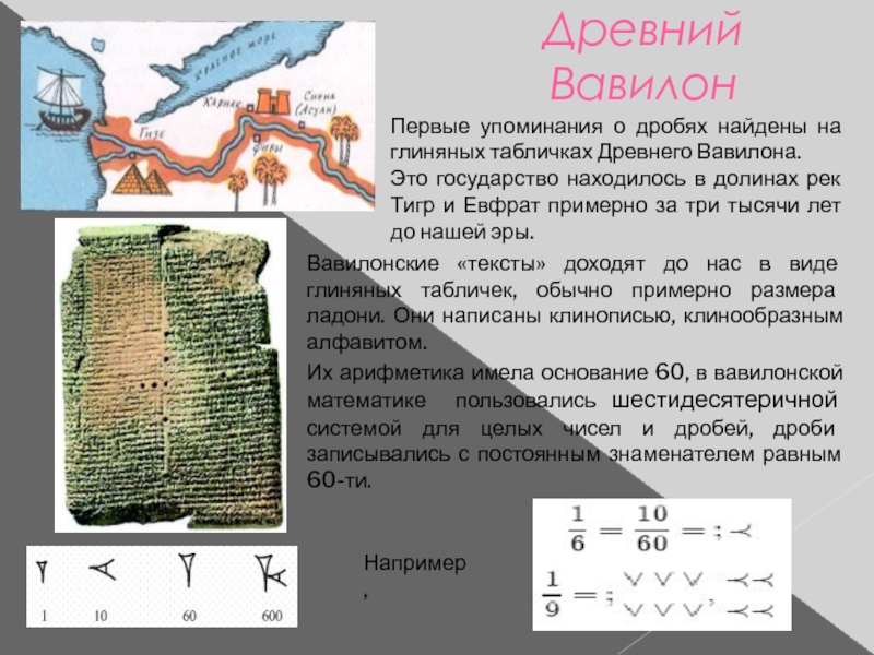 Их арифметика имела основание 60, в вавилонской математике пользовались шестидесятеричной системой для целых чисел и дробей, дроби записывались с постоянным знаменателем равным 60-ти.