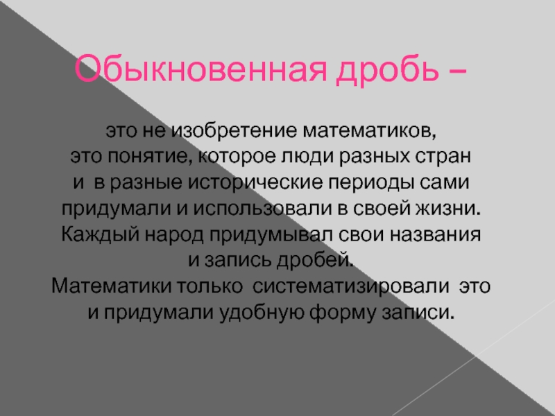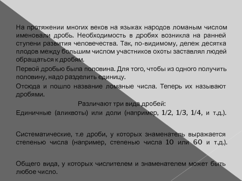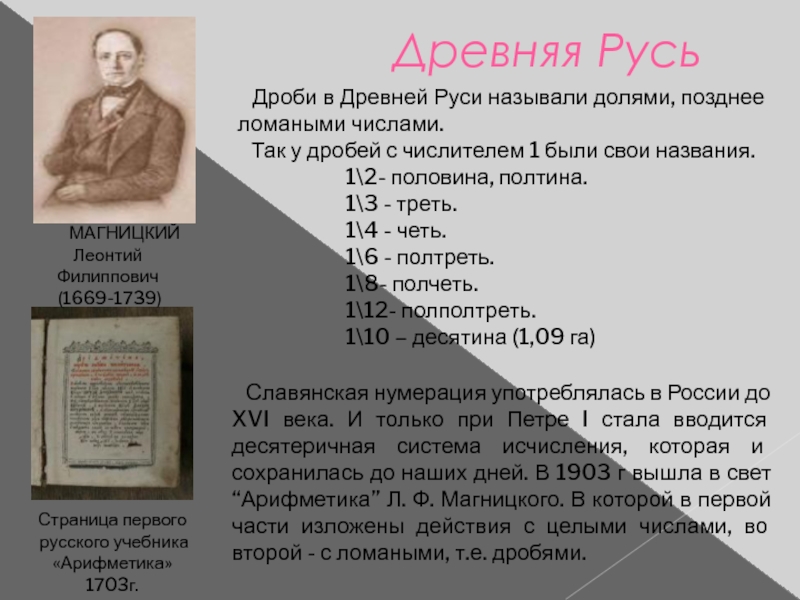 Славянская нумерация употреблялась в России до XVI века. И только при Петре I стала вводится десятеричная система исчисления, которая и сохранилась до наших дней. В 1903 г вышла в свет “Арифметика” Л. Ф. Магницкого. В которой в первой части изложены действия с целыми числами, во второй - с ломаными, т.е. дробями.