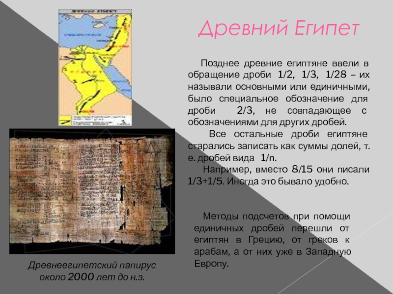 Методы подсчетов при помощи единичных дробей перешли от египтян в Грецию, от греков к арабам, а от них уже в Западную Европу.
