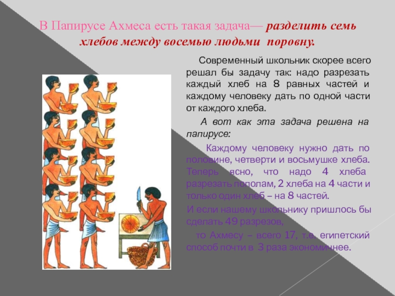Современный школьник скорее всего решал бы задачу так: надо разрезать каждый хлеб на 8 равных частей и каждому человеку дать по одной части от каждого хлеба.