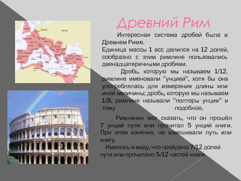 Римлянин мог сказать, что он прошёл 7 унций пути или прочитал 5 унций книги. При этом конечно, не взвешивали путь или книгу.
