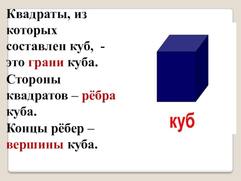 Слайд 10Квадраты, из которых составлен куб, - это грани куба.