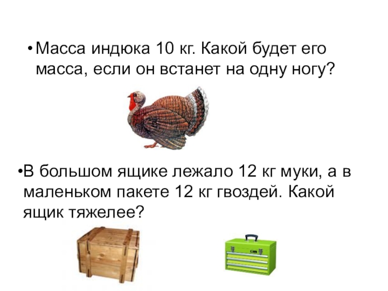 В большом ящике лежало 12 кг муки, а в маленьком пакете 12 кг гвоздей. Какой ящик тяжелее?