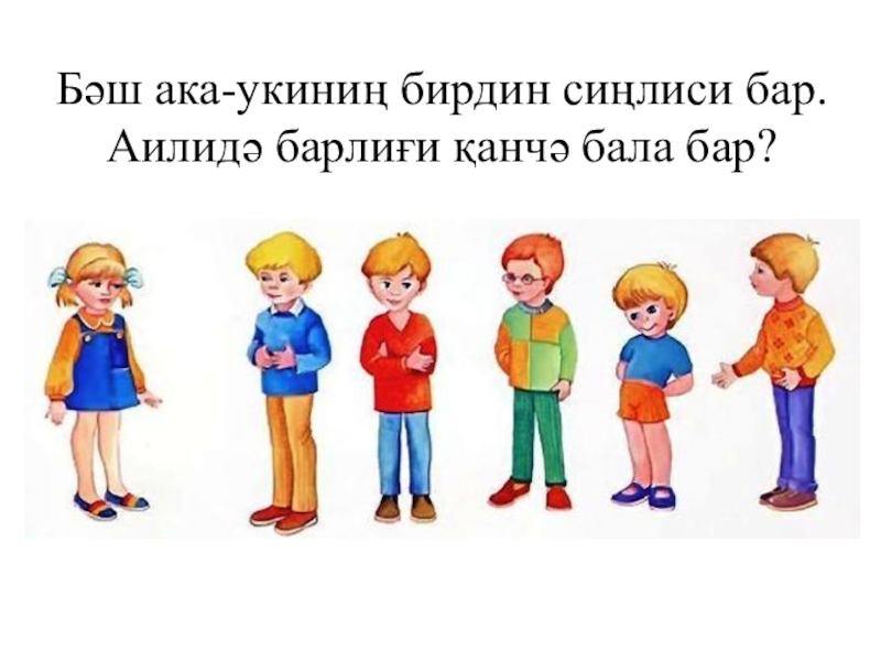 Слайд 2Бәш ака-укиниң бирдин сиңлиси бар. Аилидә барлиғи қанчә бала бар?