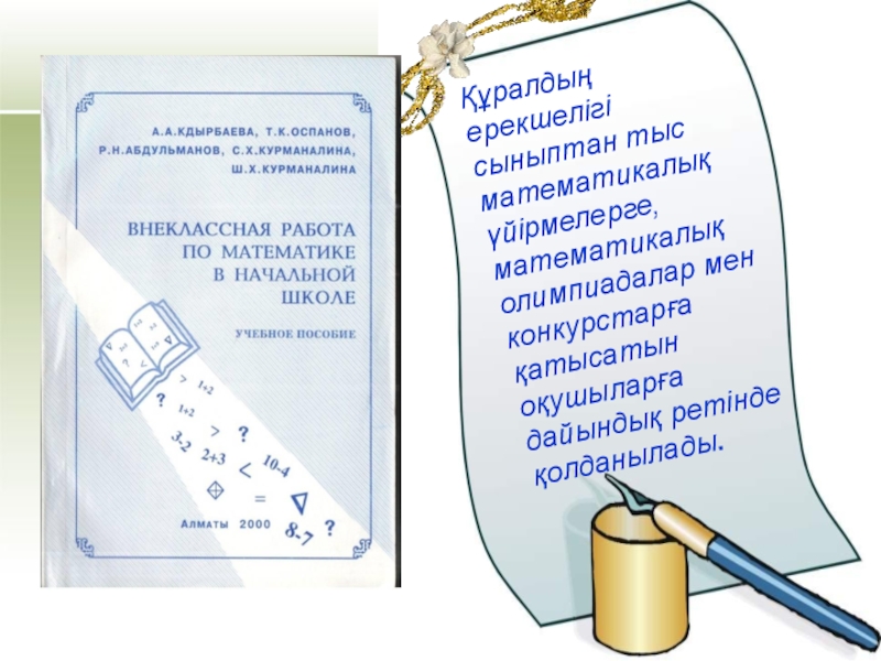 Слайд 6Құралдың ерекшелігі сыныптан тыс математикалық үйірмелерге, математикалық олимпиадалар мен конкурстарға қатысатын