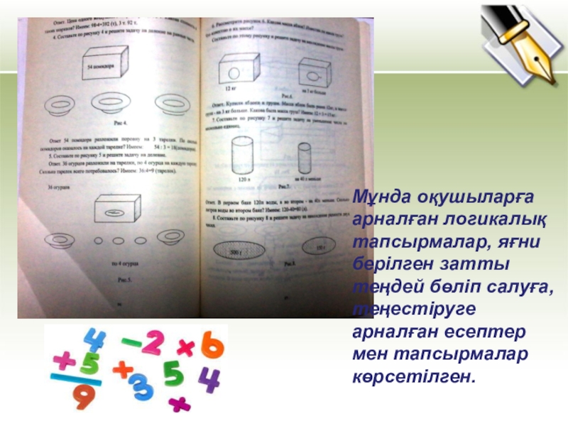 массаға, ұзындыққа арналған есептер көрсетілген. Сонымен қатар әріптің орнындағы санды табу сияқты логикалық тапсырмаларда бар.