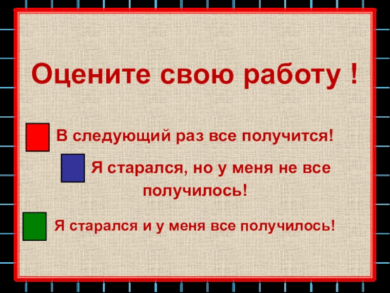 Слайд 12Оцените свою работу ! В следующий раз все получится! Я старался,