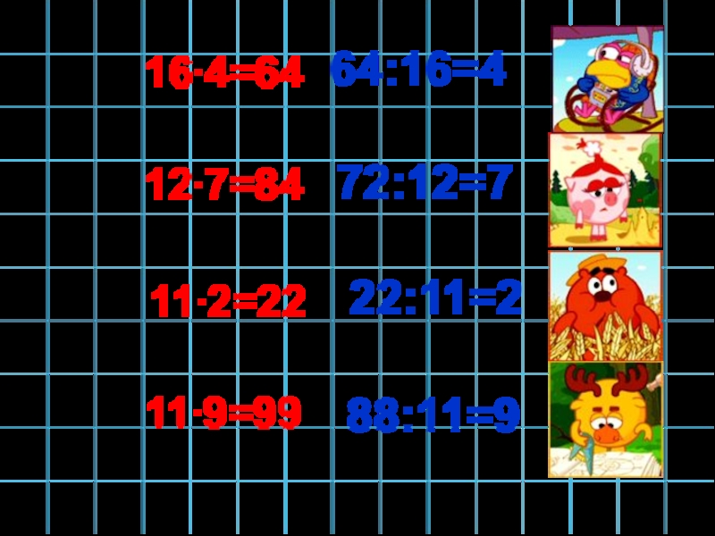 64:16=472:12=722:11=288:11=916∙4=6412∙7=8411∙2=2211∙9=99