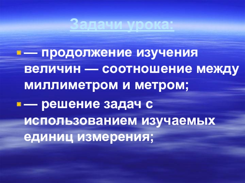 Задачи урока:— продолжение изучения величин — соотношение между миллиметром и метром;— решение задач с использованием изучаемых единиц