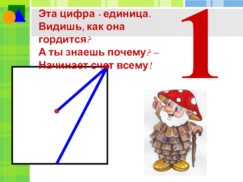 Эта цифра - единица.Видишь, как она гордится?А ты знаешь почему? –Начинает счет всему!1