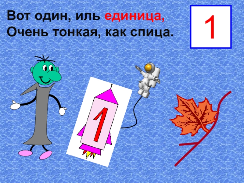 Слайд 12Вот один, иль единица, Очень тонкая, как спица.