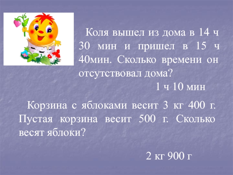 Корзина с яблоками весит 3 кг 400 г. Пустая корзина весит 500 г. Сколько весят яблоки?