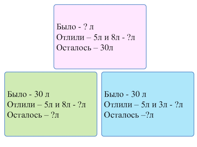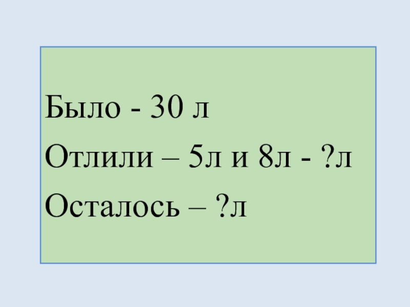 Было - 30 л Отлили – 5л и 8л - ?л Осталось – ?лБыло - 30 л