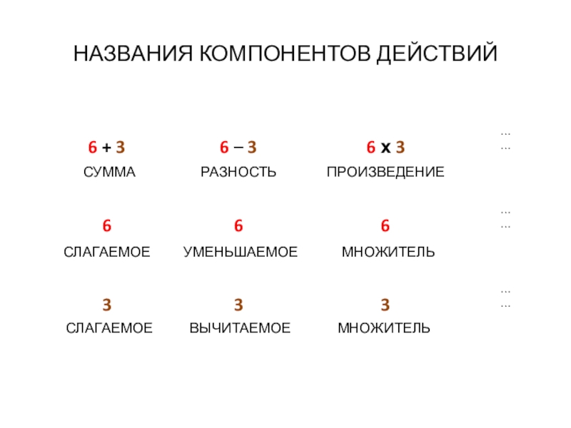НАЗВАНИЯ КОМПОНЕНТОВ ДЕЙСТВИЙСУММАСЛАГАЕМОЕСЛАГАЕМОЕРАЗНОСТЬУМЕНЬШАЕМОЕВЫЧИТАЕМОЕПРОИЗВЕДЕНИЕМНОЖИТЕЛЬМНОЖИТЕЛЬ