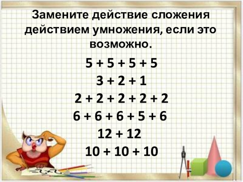 Слайд 3 Замените действие сложения действием умножения, если это возможно.