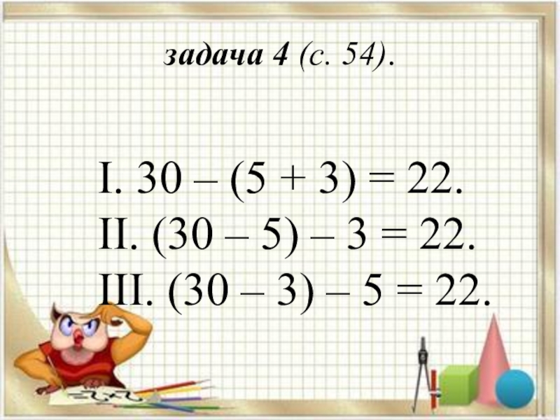 задача 4 (с. 54).   I. 30 – (5 + 3) = 22.  II. (30