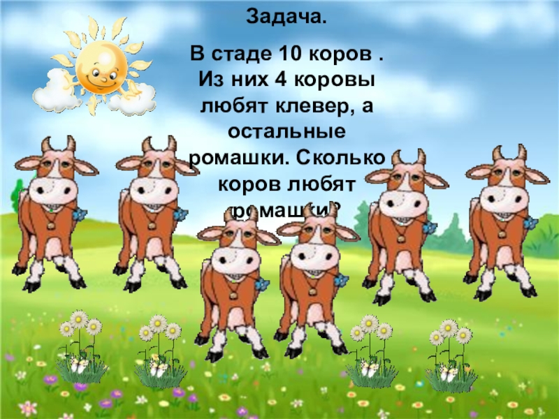 Задача.В стаде 10 коров . Из них 4 коровы любят клевер, а остальные ромашки. Сколько коров любят
