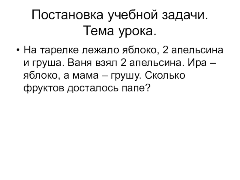 Постановка учебной задачи. Тема урока.На тарелке лежало яблоко, 2 апельсина и груша. Ваня взял 2 апельсина. Ира