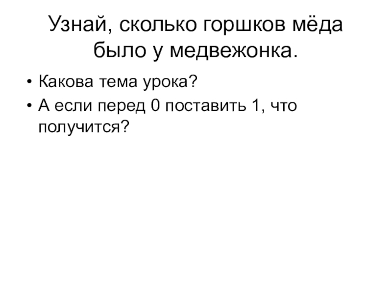 Узнай, сколько горшков мёда было у медвежонка.Какова тема урока? А если перед 0 поставить 1, что получится?