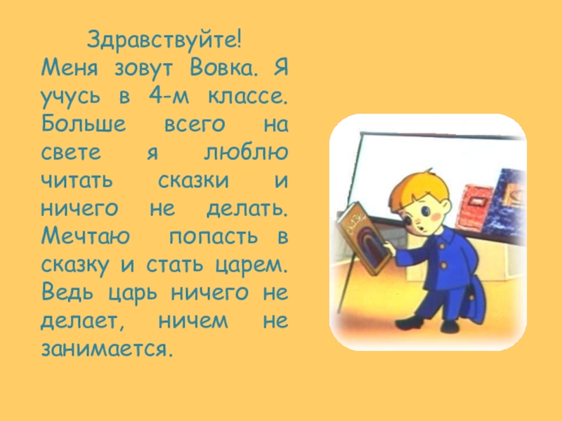 Здравствуйте! Меня зовут Вовка. Я учусь в 4-м классе. Больше всего на свете я люблю читать сказки