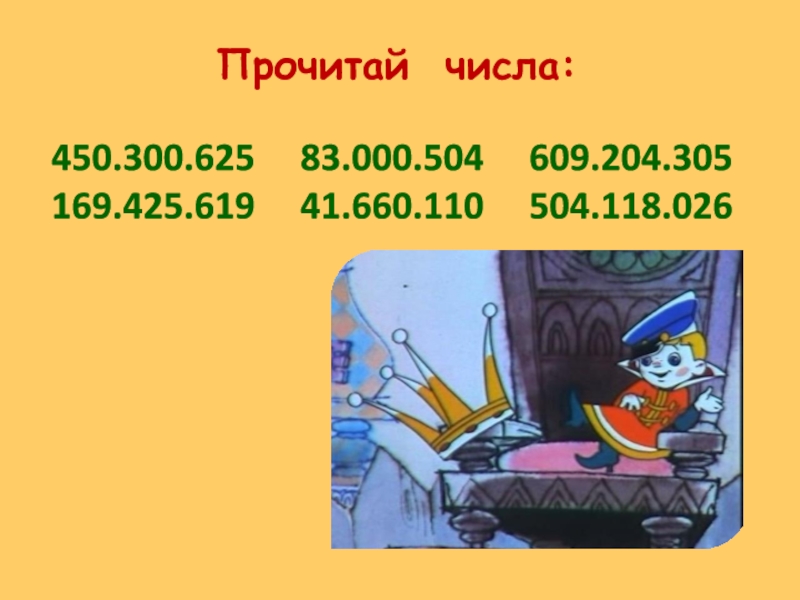Прочитай числа:450.300.625   83.000.504   609.204.305169.425.619   41.660.110   504.118.026