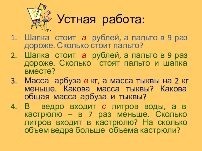 Устная работа:Шапка стоит а рублей, а пальто в 9 раз дороже. Сколько стоит пальто?Шапка стоит а рублей,