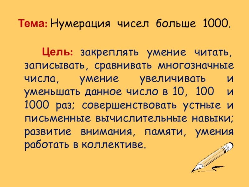 Тема: Нумерация чисел больше 1000. Цель: закреплять умение читать, записывать, сравнивать многозначные числа, умение увеличивать и уменьшать данное число в 10, 100 и 1000 раз; совершенствовать устные и письменные вычислительные навыки; развитие внимания,