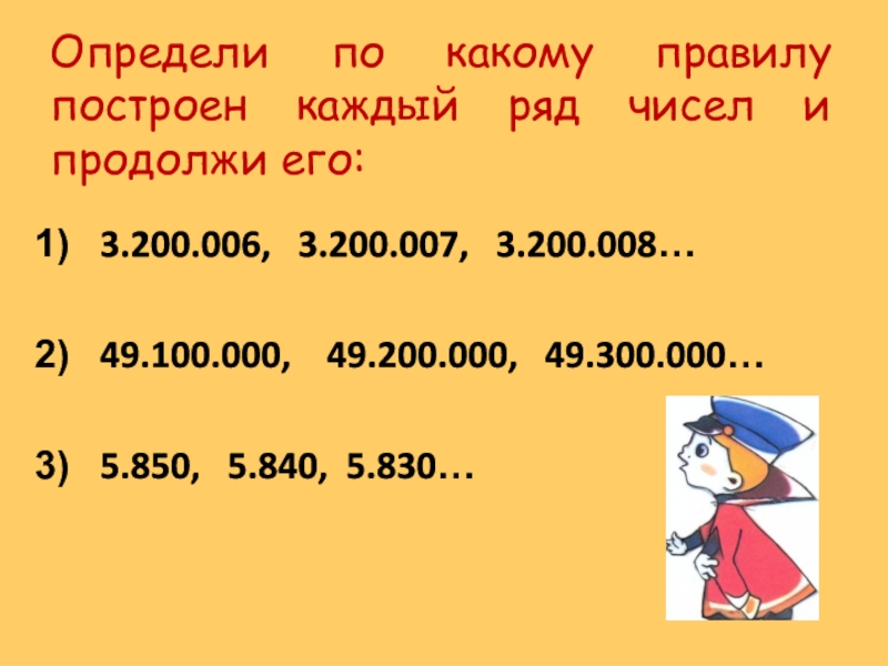 Определи по какому правилу построен каждый ряд чисел и продолжи его:3.200.006,  3.200.007,  3.200.008…49.100.000,  49.200.000,