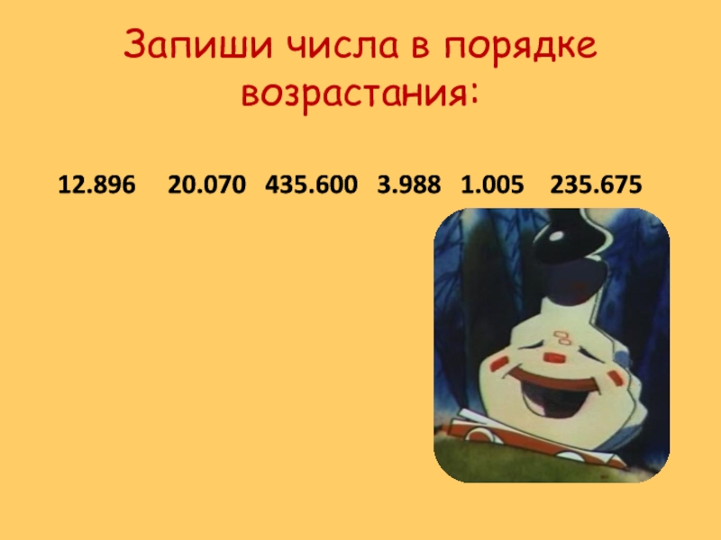 Запиши числа в порядке возрастания:12.896   20.070  435.600  3.988  1.005  235.675
