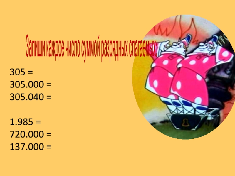 Запиши каждое число суммой разрядных слагаемых:305 =305.000 =305.040 =1.985 =720.000 =137.000 =