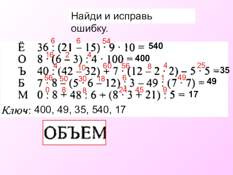 665405421644001048456256035301849656150492445089817400, 49, 35, 540, 17Найди и исправь ошибку.