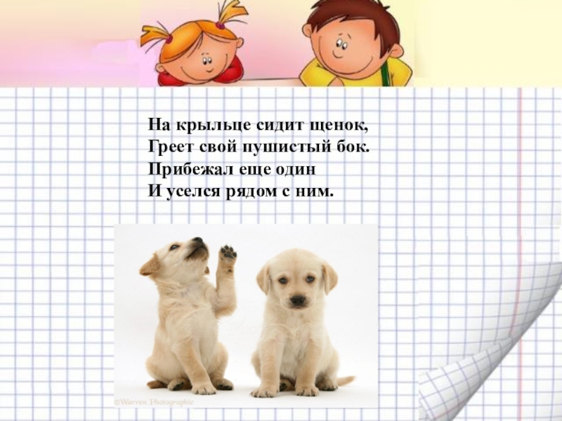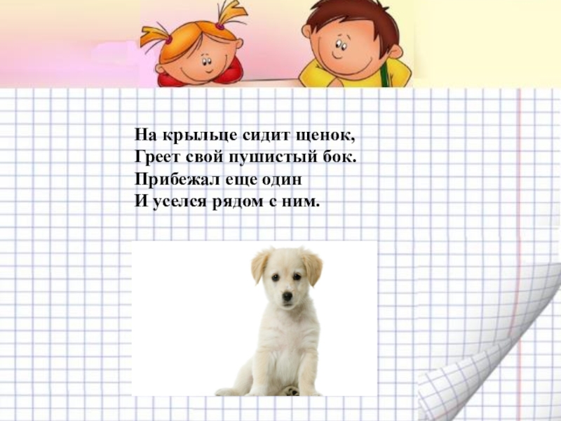На крыльце сидит щенок,Греет свой пушистый бок.Прибежал еще одинИ уселся рядом с ним.