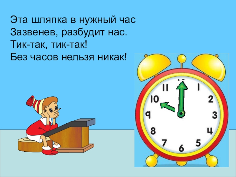 Эта шляпка в нужный часЗазвенев, разбудит нас.Тик-так, тик-так!Без часов нельзя никак!