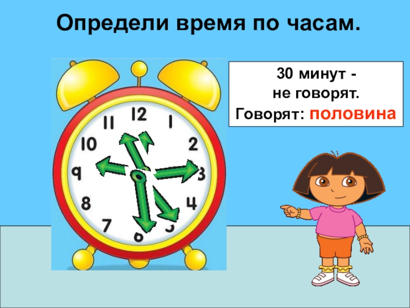 Определи время по часам.30 минут -         не говорят.