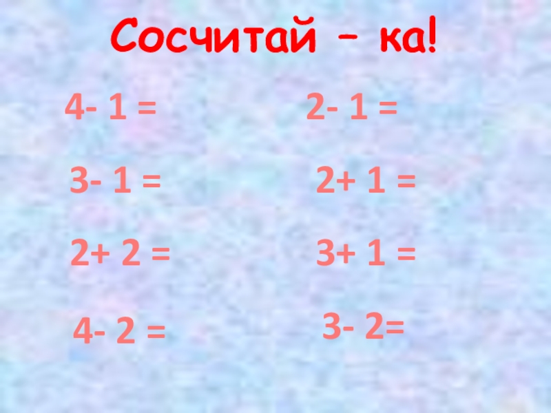Сосчитай – ка!4- 1 =3- 1 =2+ 2 =4- 2 =2- 1 =2+ 1 =3+ 1 =3- 2=